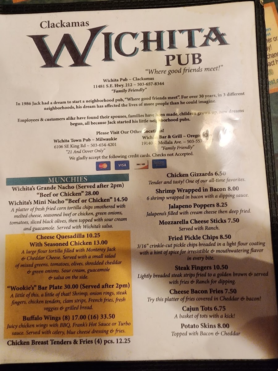 Welcome to Wichita Pub, your go-to spot for a delightful bar and grill experience in Clackamas, Oregon. Situated at 11481 SE Hwy 212, Wichita Pub greets you with a diverse menu that caters to all cravings.